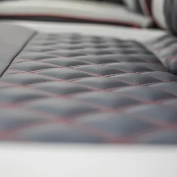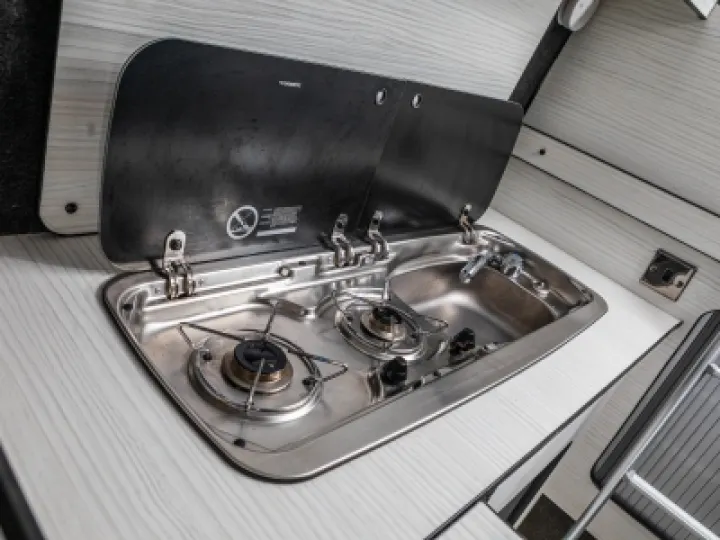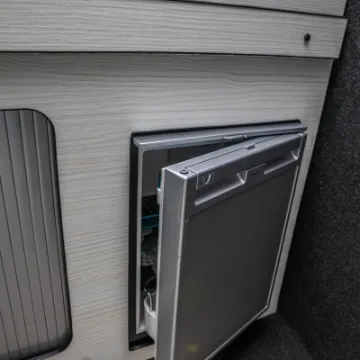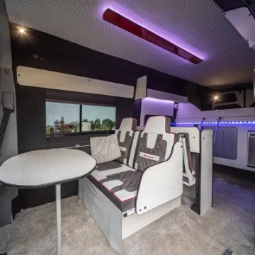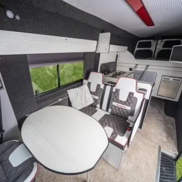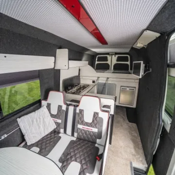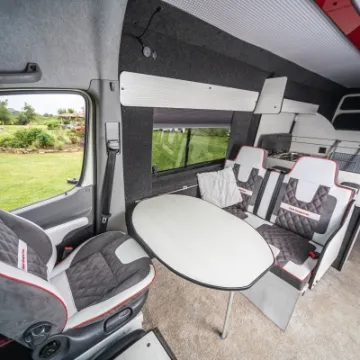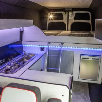 Inside you've got swivel front seats with a TV and DVD system. limo tinted glass, Smev 9222 hob/sink and a Waeco CRX50 fridge/freezer. The interior is beautifully finished with leather and suede upholstery with the front seats matching the generous fixed double and R&R double bed. There is also a free-standing table, freshwater tank and the whole package is fully insulated .